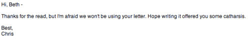 Struggling through the torture of “Awesome Abs” today also helped tamp down a minor disappointment: McSweeney’s* did not like my open letter as much as my friends did.