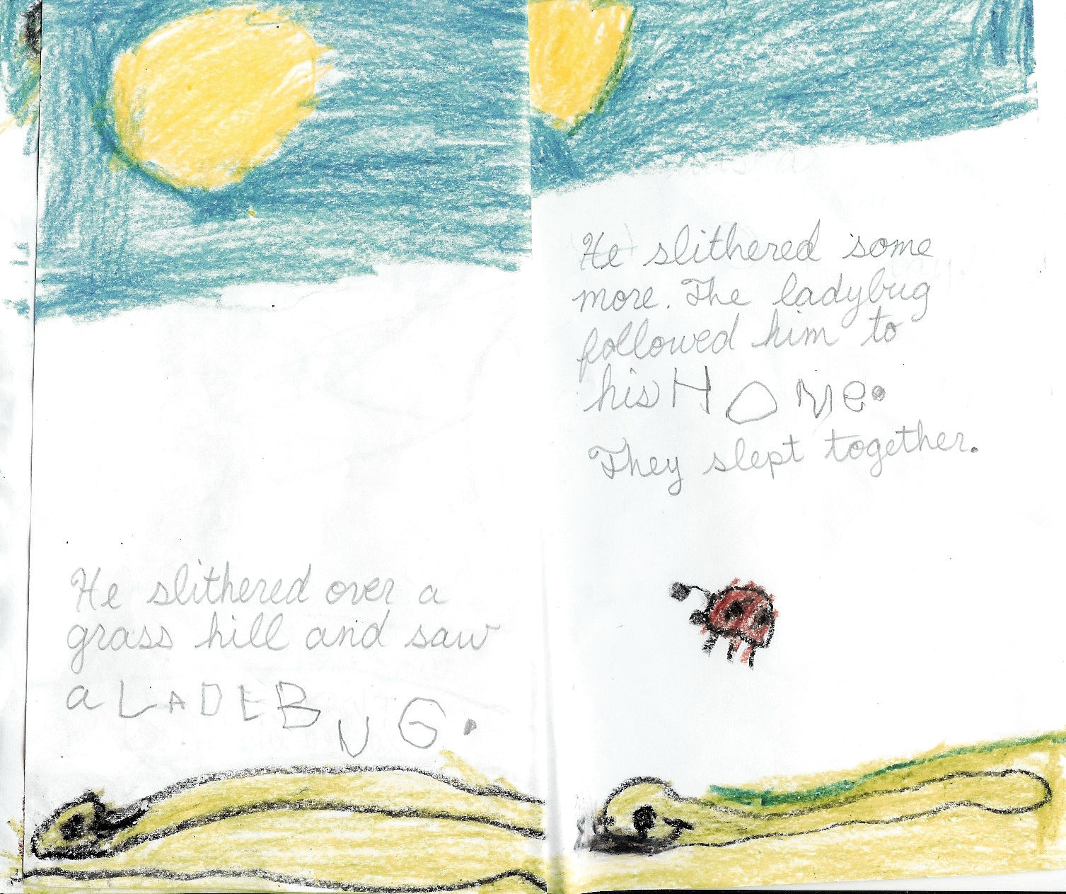 He slithered over a grass hill and saw a ladybug. He slithered some more. The ladybug followed him to his home. They slept together.