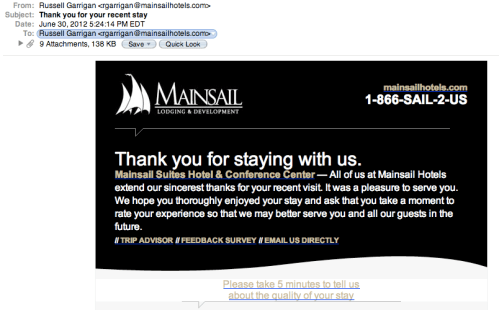 You seem sincere in your request for feedback about my recent stay at Mainsail Suites Hotel & Conference Center in Tampa. Your title of “performance and quality assurance manager” indicates that Mainsail in general is interested in enhancing the guest experience.