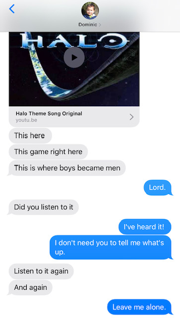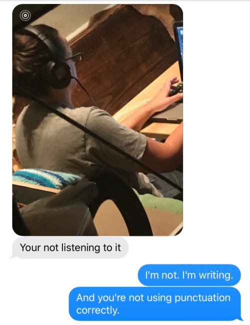 Words: I text in full sentences with proper grammar and punctuation. (Of course I do.) Gideon does too. Dominic texts in words without grammar or punctuation, and I want to die.