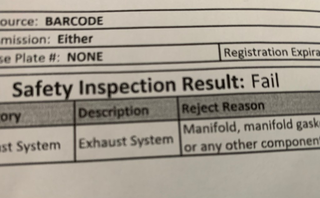 It failed the safety inspection because it needed a new catalytic converter, engine mounts, an engine leak fixed, etc.