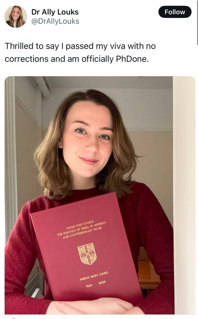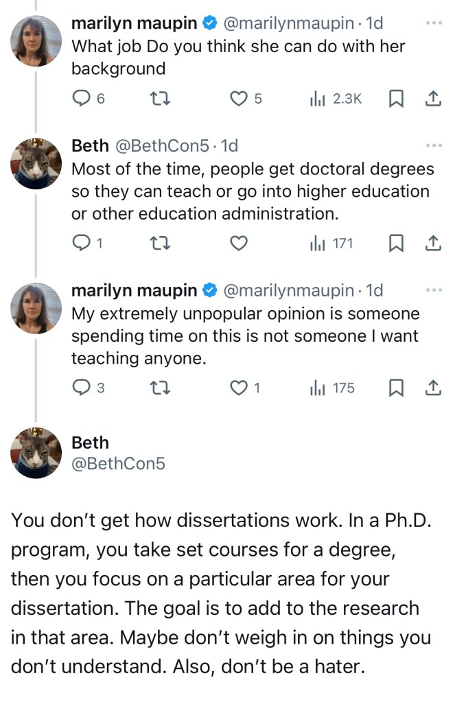 A woman defended her dissertation and posted about it. Normal people would say “Congrats!” and go on with their lives.