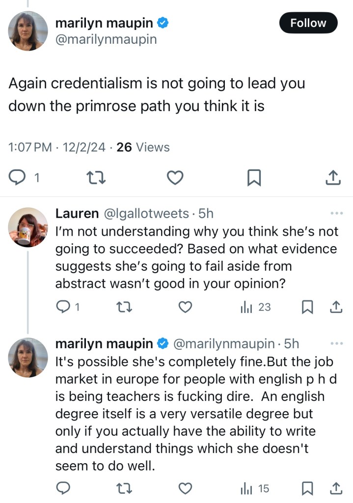 Well, Marilyn, who claims she worked successfully as a technical writer at a Fortune 300 company without needing more than a high-school degree, thinks that Dr. Louks can’t write, isn’t a deep thinker, wasted her time on an advanced degree, and won’t get a job.